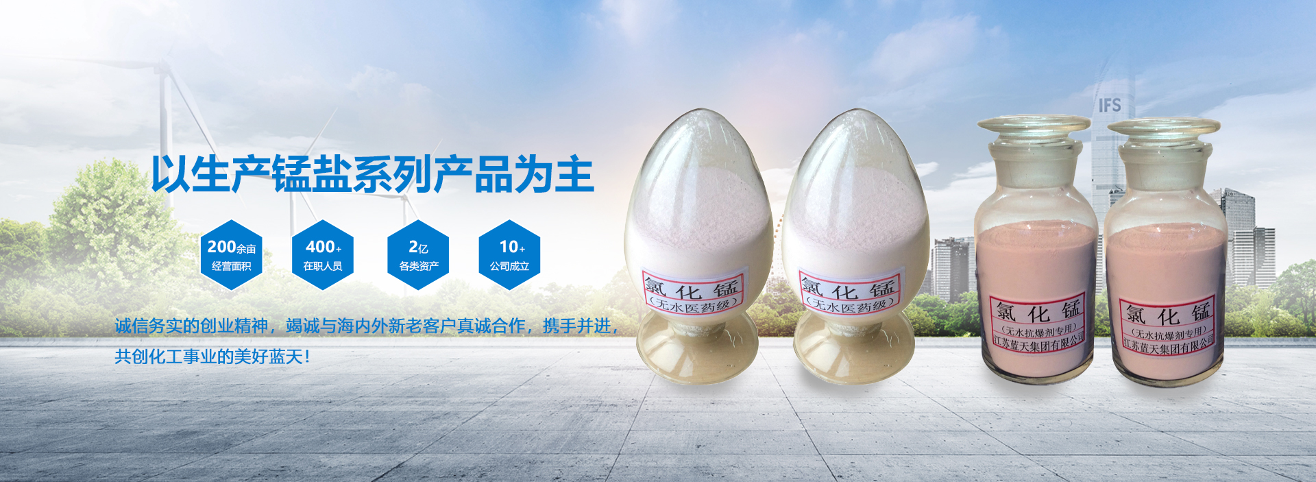 淮安市藍天化工有限公司,是以生產錳鹽等無機鹽系列產品為主。農藥中間體、醫藥中間體加工、新產品研發為一體的大型綜合性民營企業。公司業務遍及海內外數十個城市與地區,現擁有各類資產2億多元,生產經營面積200余畝,員工400多人。其中各類專業技術人員占1/3以上。并具有較強的技術研發和生產能力?,F已初步形成一支高素質、敬業愛崗、廉潔高效的作戰團隊。